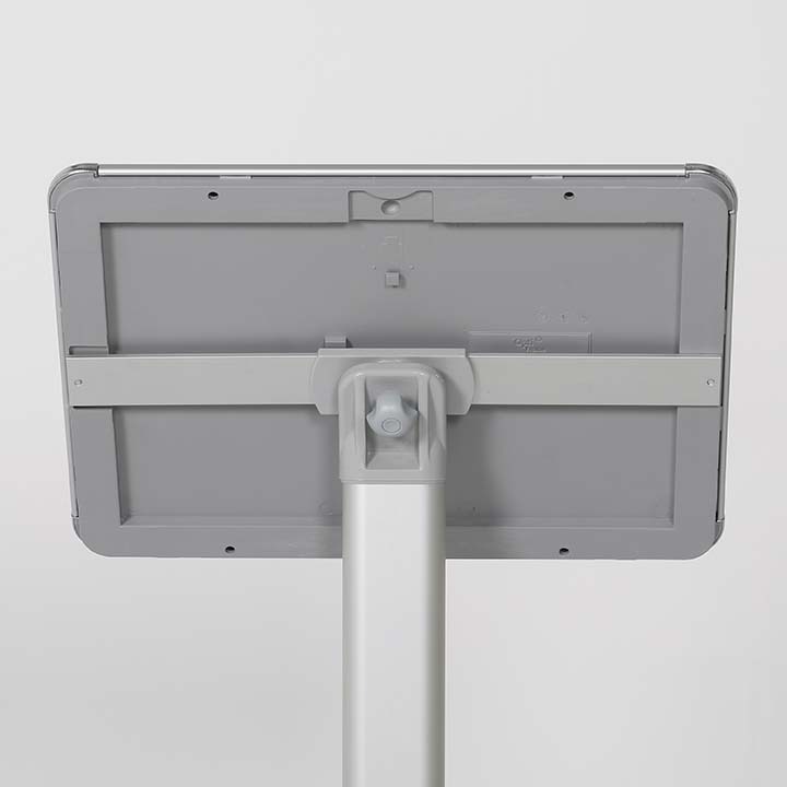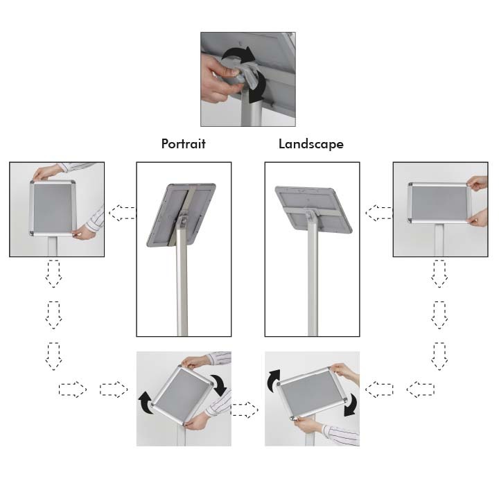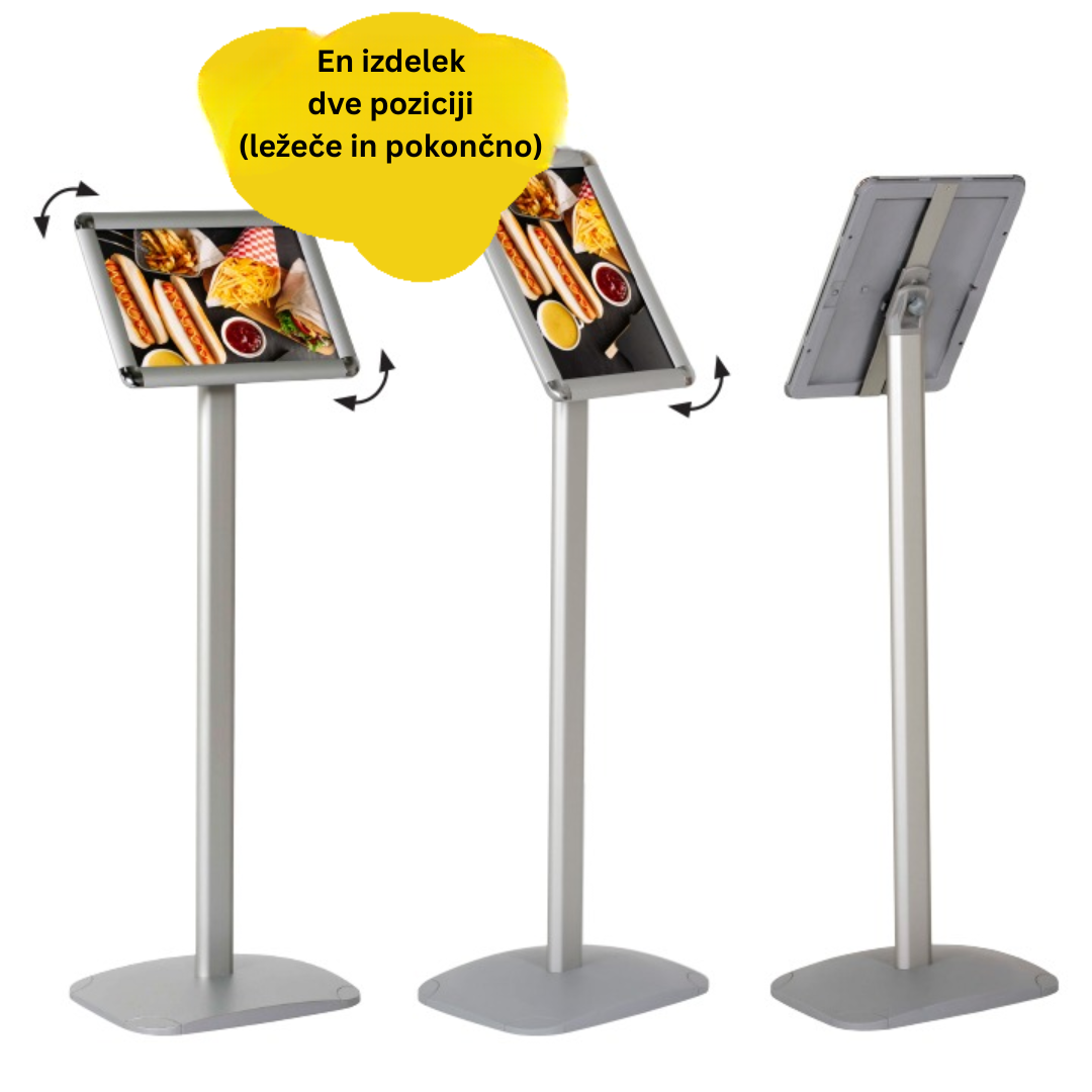 Stojalo odlikuje stabilno kovinsko podnožje in aluminijasta konstrukcija, ki zagotavljata zanesljivost in dolgo življenjsko dobo tudi v bolj obremenjenih prostorih. Okvir omogoča hitro menjavo vsebine (clip sistem) ter uporabo v pokončni ali ležeči postavitvi, kar poveča fleksibilnost uporabe.