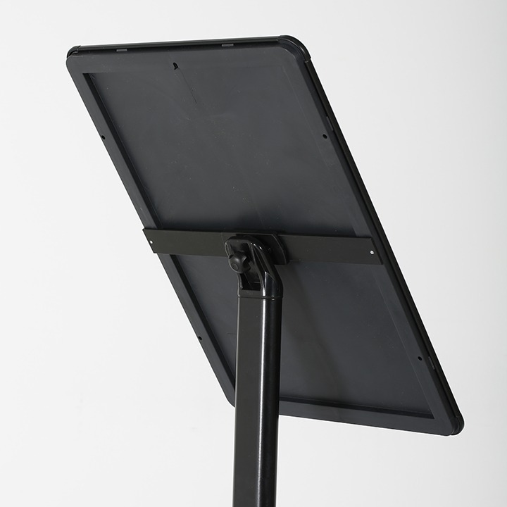 Stojalo odlikuje stabilno kovinsko podnožje in aluminijasta konstrukcija, ki zagotavljata zanesljivost in dolgo življenjsko dobo tudi v bolj obremenjenih prostorih. Okvir omogoča hitro menjavo vsebine (clip sistem) ter uporabo v pokončni ali ležeči postavitvi, kar poveča fleksibilnost uporabe.