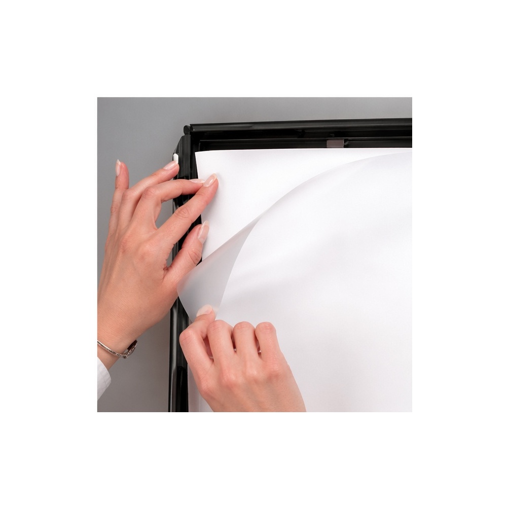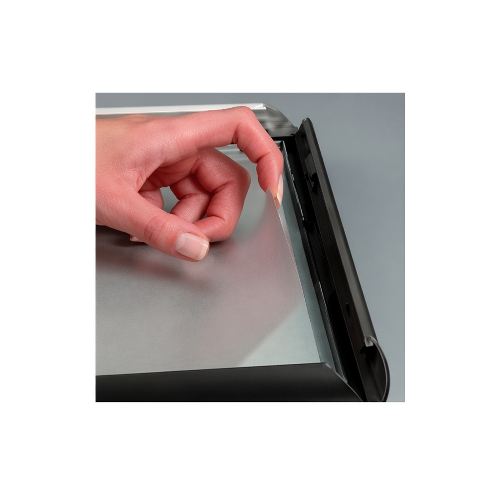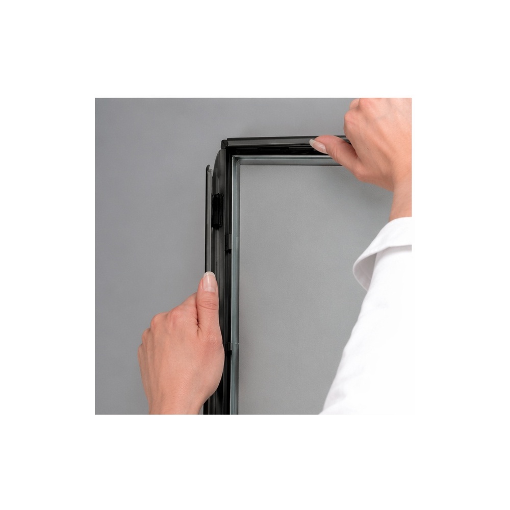 Zahvaljujoč snap (klip) sistemu lahko vsebino hitro zamenjate brez odstranjevanja okvirja s stene, kar je idealno za pogosto menjavo plakatov. Okvir je izdelan iz aluminija z zaščitno antirefleksno folijo, ki ščiti vsebino pred umazanijo in bleščanjem ter izboljša berljivost.